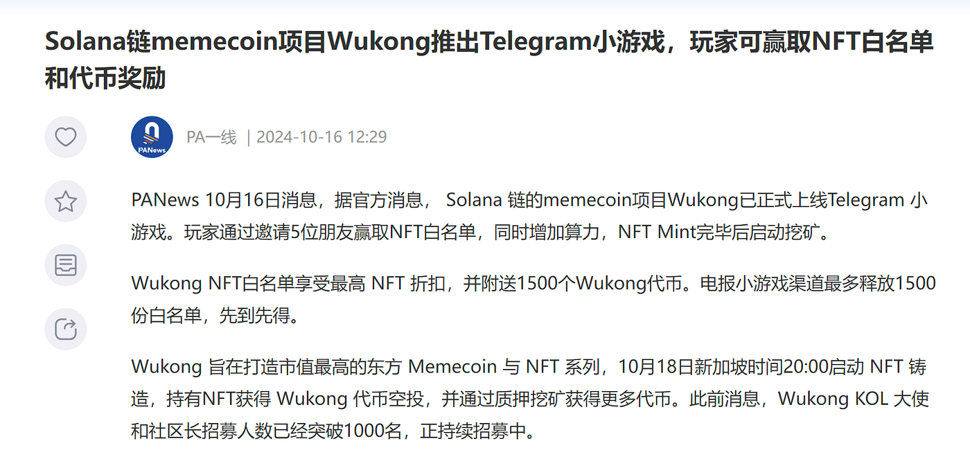 纵观整个 NFT 以及 Meme币 市场,已经很久没有出现像 Wukong 这样制作精良且玩法创新的项目了。