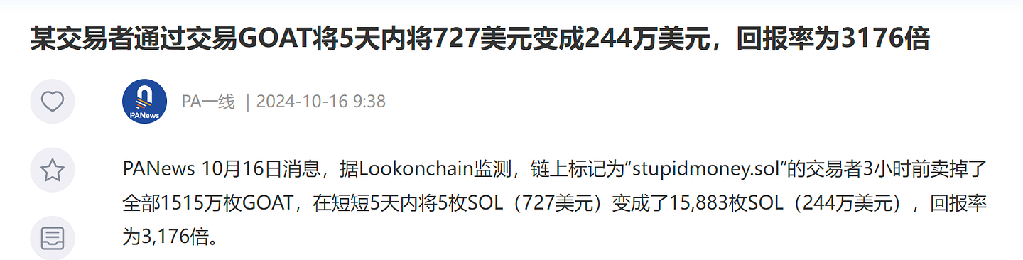 GOAT创造6天涨幅上千倍,市值达到了3亿美金,有用户通过购入727美元最终赚了244万美元,回报率达到3,176倍。