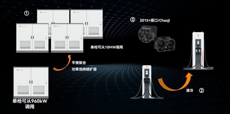 星星充电独创的“聚合功率池”技术,是对原有功率池技术的迭代,更是此次升级的核心引擎。通过动态聚合多个主机柜的功率资源,突破单机柜容量限制,实现2.88MW标准功率输出,并支持灵活扩展至10MW。