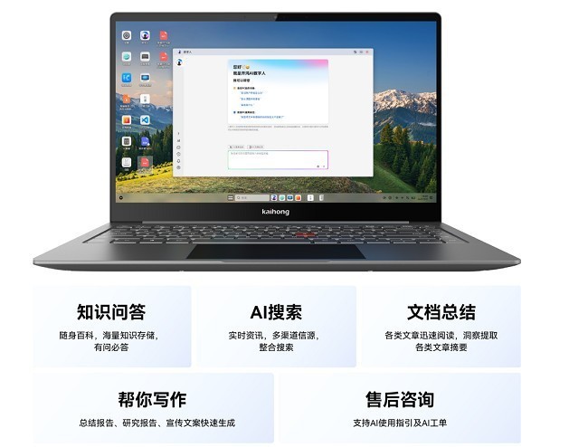 开鸿Bot产品搭载原生AI助手,支持键盘一键唤醒,具备文档总结、知识问答、AI搜索等功能,协助开发者提升效率。配合国产OS与芯片方案,产品采用安全域隔离、出域加密等机制保障数据安全,并提供持续OTA系统更新服务,保障系统稳定性和安全性。