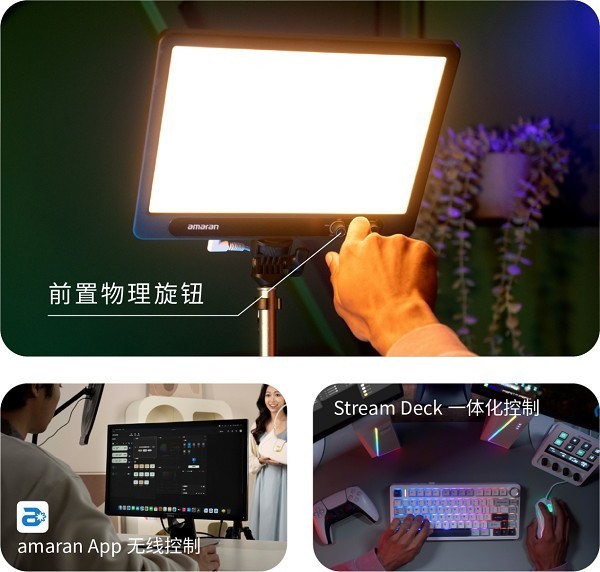 配备直观前置物理旋钮,你无需绕到背后,就能在创作或直播过程中随时控光。支持手机或电脑通过amaran App进行无线控制,兼容 Stream Deck ,轻松实现多设备联动。无论是亮度、色温的精细调节,还是灯光效果、预设编程等高级控制,都能随心掌控,确保创作过程流畅不间断。
