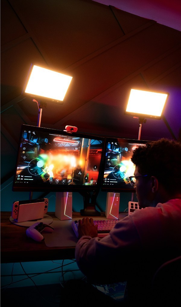 amaran Verge 专为桌面环境量身打造,纤薄灯体配备方形发光面,柔和灯光让人物更上镜,画面氛围更佳。创作者可使用支架将灯体放置于桌面或地面,也可通过夹具稳固安装在桌子边缘,为个人直播或拍摄提供充足的柔和照明,满足桌面创作者对于高质量布光的想象。