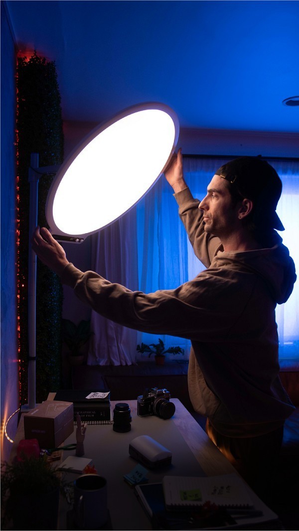小型工作室创作者及专业电商卖家拥有较大工作空间,需要在一定距离下为主播和商品提供照明。amaran Verge Max 配备超薄灯体及55cm大直径圆形灯面,提供媲美传统柔光箱方案的大面积柔光,可放置桌面或地面使用,适应不同拍摄角度与布光需求。