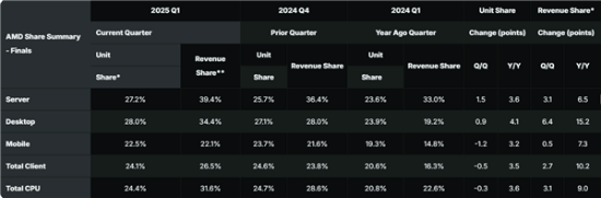 此外,AMD在移动处理器市场的份额也在逐步扩大,市场份额达22.5%,收入份额为22.1%。与去年同期相比,收入份额提升了7.3个百分点,显示出移动端业务的稳步发展。