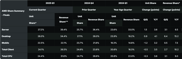 根据最新数据显示,2025年第一季度,AMD在服务器市场的收入占比达到39.4%,接近四成,显示出其在该领域的强劲竞争力。与此同时,其在桌面市场的收入份额也达到了34.4%。