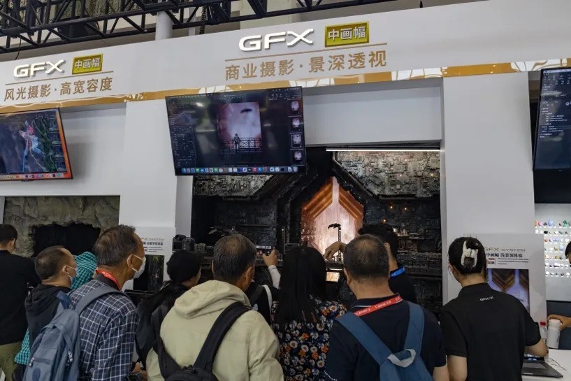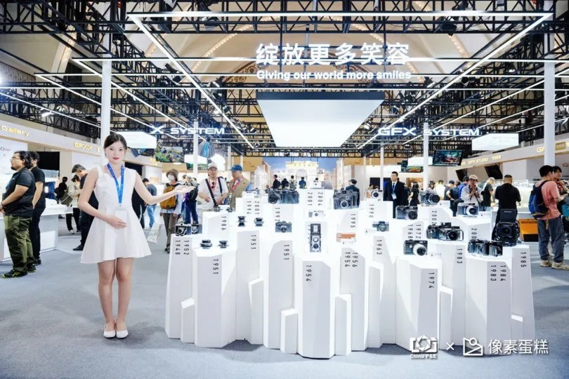 富士今年仍然搭建有千余平米的展区,携全线数码影像解决方案与大家见面。展会上有大家并不陌生的胶片博物馆、全球名家摄影展、实景拍摄等体验区。富士本次展出相机最吸引眼球的当然还是中画幅系列,尤其是今年发布时间不长的GFX100RF,其采用紧凑、轻量化、类旁轴取景器的设计,并搭载1.02亿像素分辨率,让影像创作提升至新境界。