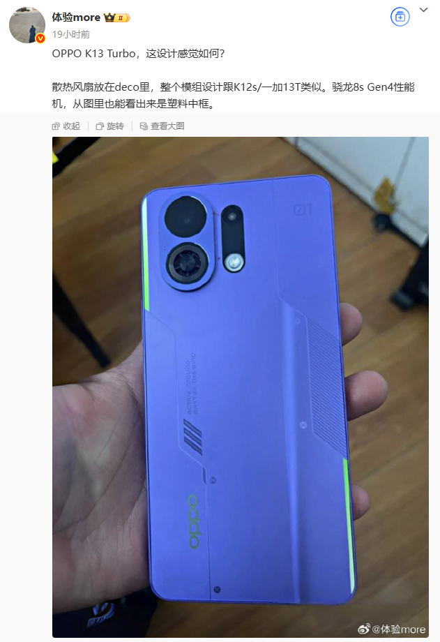 据数码博主 @体验more 近日透露,即将推出的 OPPO K13 Turbo 手机在外观设计上将引入机甲风格的后盖,并在摄像头模组区域加入主动散热风扇,整体设计风格与此前发布的 K12s 以及一加 13T 相似。