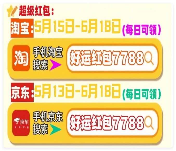 首先,划重点!今年天猫/淘宝和京东的618红包口令都是「好运红包7788」要记住!领的红包大小和你搜索的什么口令有关的!这个双平台通用口令包领到大的!记得每天去领!