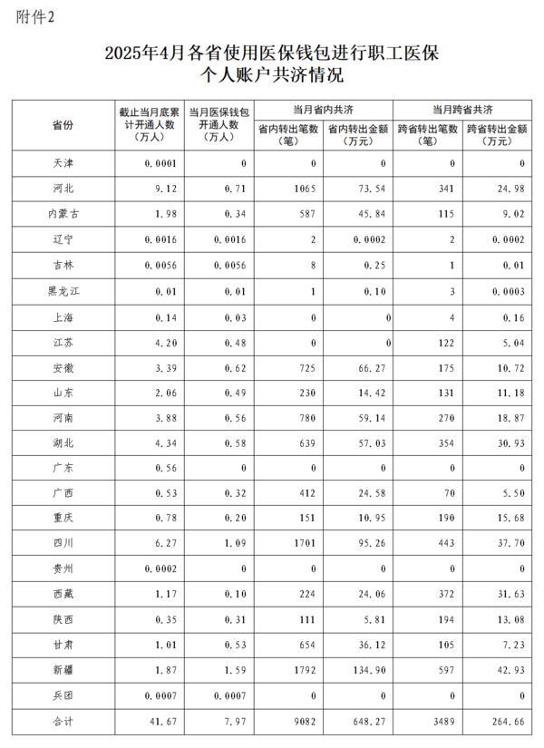 2025年4月,通过医保钱包转账方式进行职工医保个人账户省内、跨省共济共1.26万笔,转账金额912.93万元;支付就医购药费用总计0.59万笔,支付金额109.52万元。从共济地域看,省内转账0.91万笔,转账金额648.27万元;跨省转账0.35万笔,转账金额264.66万元。