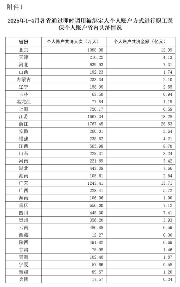 2025年1-4月,通过即时调用被绑定人个人账户方式进行职工医保个人账户省内共济的人次1.33亿,共济金额177.59亿元。