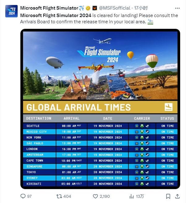《微软模拟飞行2024》官方宣布,该作将于背景时间11月20日0点正式解锁,官方还公开了各个地区的解锁时间。