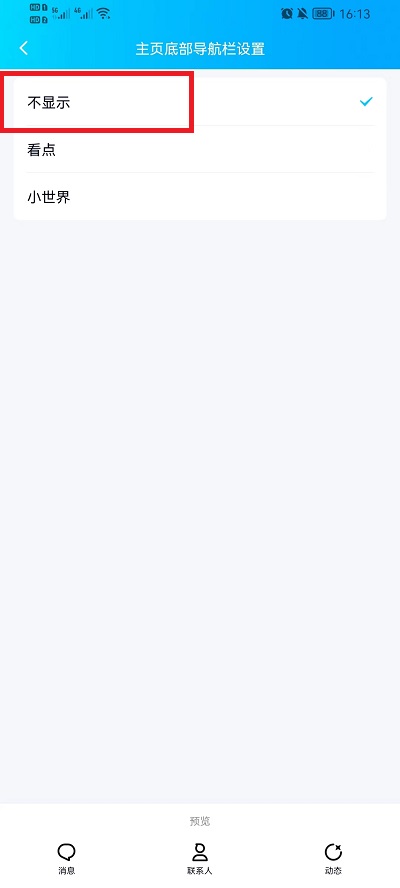 5、最后把其中切换成【小世界】就可以打开小世界,让QQ小世界在我们的导航栏底部出现。