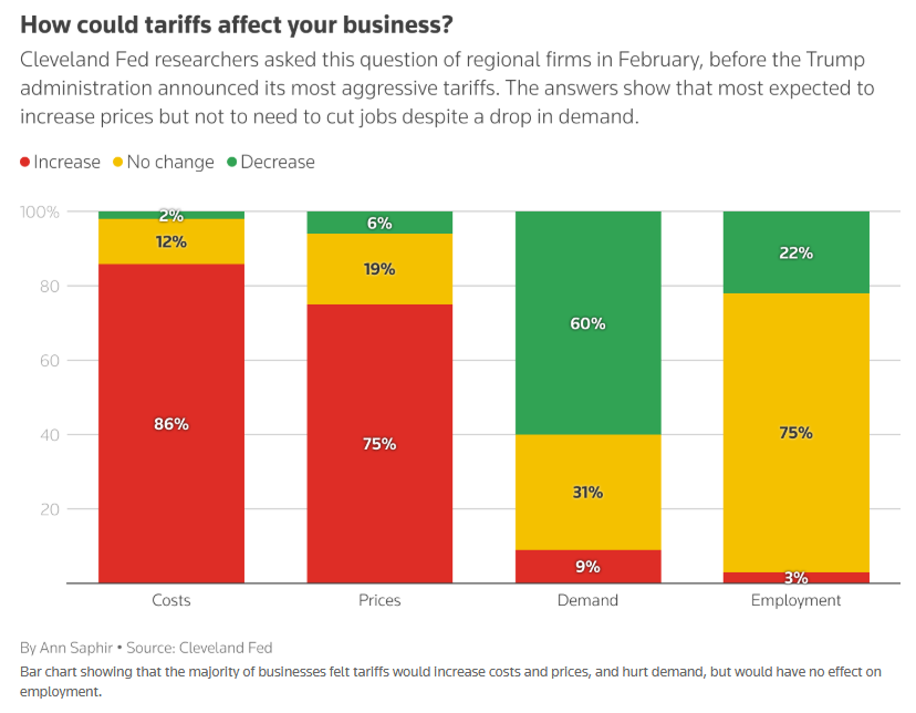 波士顿联储研究人员在特朗普就职前对小企业进行的一项与关税相关的预期调查发现,企业平均预期的关税力度低于实际水平:它们预计对墨西哥和非亚洲国家的关税为15%,对欧洲为14%,对加拿大为13%。企业表示,将在两年内将成本上涨转嫁给消费者;非进口企业认为关税对价格影响不大,甚至可能降低成本。