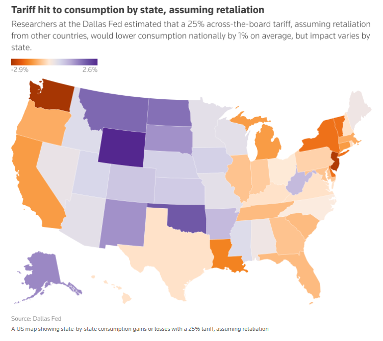 假设关税收入通过减税等方式回流给消费者,25%的全面关税若未遭报复,实际上可能使美国消费增长约0.5%。但同样的关税若遭遇报复,将导致消费总体下降1%,各州受到的影不同:华盛顿州下降2.9%,怀俄明州增长2.6%。与任何税收一样,关税影响因当地经济结构而异,更依赖全球供应链或居民消费更多进口商品的州可能比其他州遭受更严重打击。