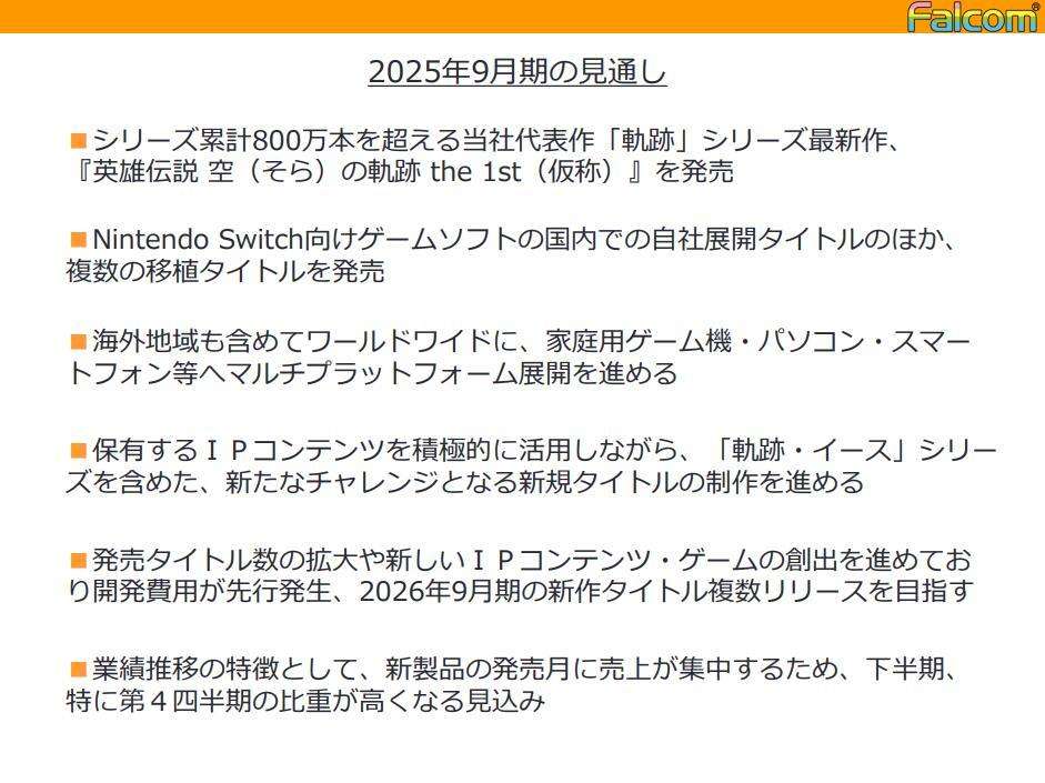 《英雄传说:空之轨迹 the1st》预计将会在2025年9月30日前发售,并且继续在Switch平台上推出数款移植作品,此外还提到公司目标是能在25-26财年时发布多款新作。