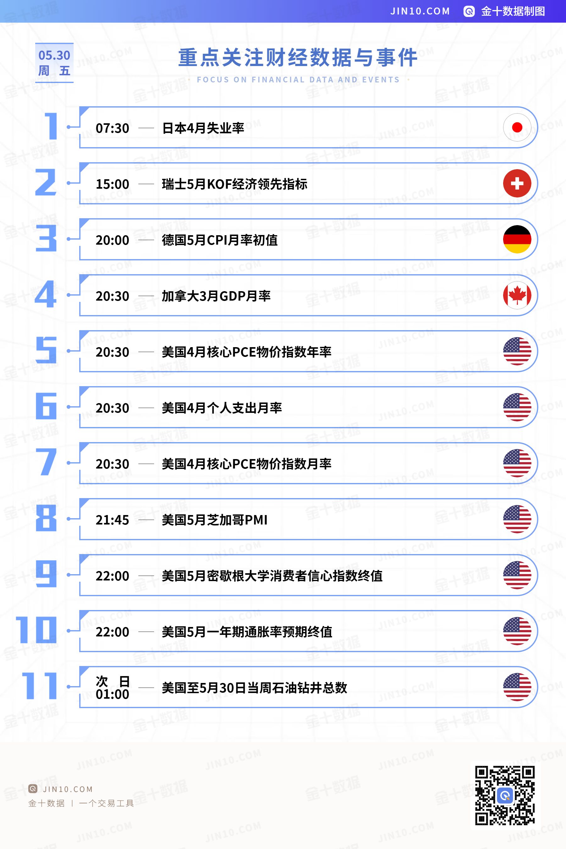 20点30分,美国将公布4月PCE物价指数及4月个人支出月率;