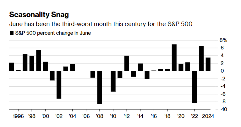 美股涨势的首次考验将是6月18日的美联储利率决议。两天后将迎来“三巫日”,届时大量股票相关期权到期将放大波动性,而月末则是季度投资组合再平衡。这些关键节点将决定多头能否在标普500指数逼近6000点(关键心理关口)之际继续推高股市。