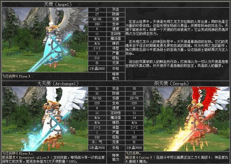 大天使:强大的上级单位,拥有极强的作战能力和特殊技能,如复活死去的士兵。