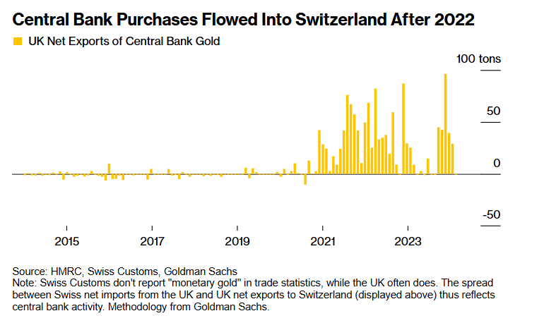 2022年后,从英国出口并途经瑞士的黄金数量激增,贸易数据的差异显示,过去三年有超过1200吨央行持有的黄金进入瑞士。这些黄金随后要么存放在瑞士的金库中,要么被运往其最终所有者那里。