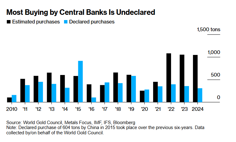 衡量央行和主权财富基金购买量最广泛使用的数据是由代表黄金开采商的行业组织世界黄金协会收集的。它综合使用公开数据、贸易统计和实地研究。2024年,他们发现的购买量中只有约三分之一是公开的。