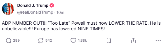 在“小非农”数据公布之后,美国总统特朗普迅速发帖开喷鲍威尔,其写道:“ADP就业报告出来了,‘太迟先生’美联储主席鲍威尔现在必须降息。他令人无语!!欧洲已经降息了九次!”