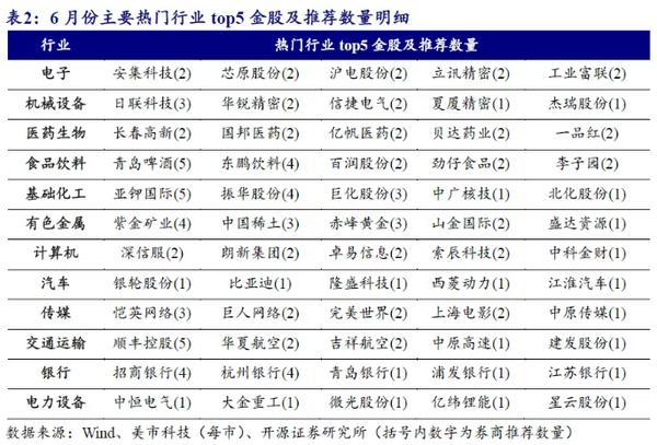 开源证券数据显示,相较5月份,6月券商金股增加最多的行业分别为非银金融、基础化工、传媒,增幅分别为1.7%、1.5%和1.4%。