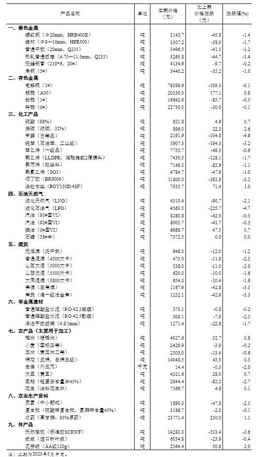2025年5月下旬流通领域重要生产资料市场价格变动情况