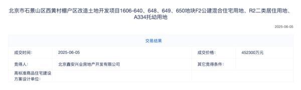 根据成交结果,该地块由中海地块旗下北京鑫安兴业房地产开发有限公司以底价452300万元摘得,折合成交楼面价27471元/平方米。