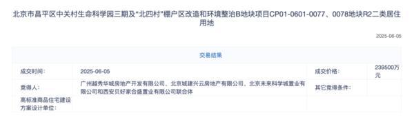 成交结果显示,广州越秀华城房地产开发有限公司、北京城建兴云房地产有限公司、北京未来科学城置业有限公司和西安贝好家合盛置业有限公司联合体以底价239500万元摘得,成交楼面价为29977元/平方米。