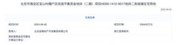 相邻地块为京土储挂(海[2025]018号地块,即北京市海淀区宝山村棚户区改造平衡资金地块(二期项目HD00-1412-0017地块,该地块用地性质同样为二类城镇住宅用地,土地面积为28592.77平方米,规划建筑面积为60044.817平方米,该地块的起始价格为331500万元。根据成交结果,该地块由北京金隅地产开发集团有限公司以336400万元竞得,成交楼面价为56025元/平方米,溢价率1.48%。