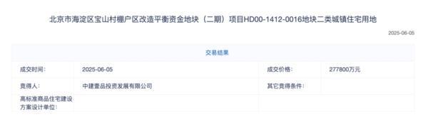 此次海淀区推出的两宗地块相邻,且均吸引多家房企竞价。其中,京土储挂(海[2025]017号地块为北京市海淀区宝山村棚户区改造平衡资金地块(二期项目HD00-1412-0016地块,该地块位于海淀区四季青镇,用地性质为二类城镇住宅用地,土地面积为24009.55平方米,规划建筑面积为50420.055平方米,地块起始价格为273000万元。