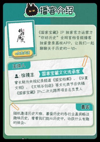 此次播客节目《国家宝藏 你好历史》独家上线荔枝App,也将继续探索如何让专业内容轻量化、趣味内容有深度。无论你是一位拥抱慢生活的历史爱好者,还是为心灵寻找归处的赶路人,欢迎加入这场有声有色的历史之旅。