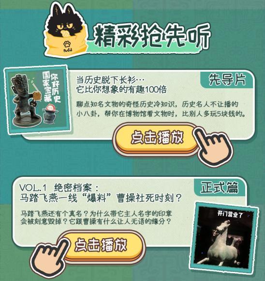 马踏飞燕还有个真名?为什么带它主人名字的印章会被刻意毁掉?它跟曹操会有哪些让人无语的缘分?——据悉,《国家宝藏 你好历史》主播将会解读国宝故事和背后的历史,也会不定期邀请大咖嘉宾做客探讨历史热点、奇闻轶事,用声音传递历史的温度和思想的力量。现在,上荔枝App搜索“国家宝藏”可抢先收听节目的先导片及第一期节目,并有机会获得由“国家宝藏 你好历史”送出的“食神”富贵猫纪念周边或荔枝官方周边荔枝妹公仔等惊喜好礼。