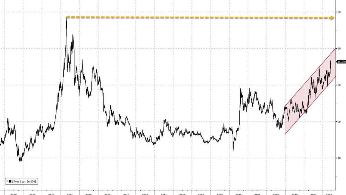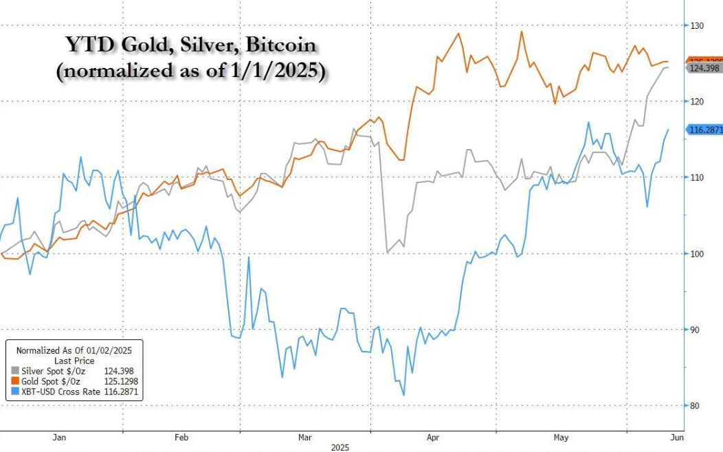 令人意外的是,尽管黄金在2025年初疯狂上涨,比特币也在4月初暴跌后强势反弹,但白银即将超越黄金,成为2025年表现最佳的资产。