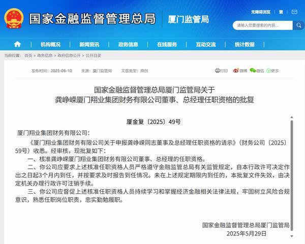 龚峥嵘获批担任厦门翔业集团财务公司董事、总经理