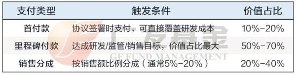 大家常说的创新药“出海”通常指的是License-out(对外授权这一步,也就是我国创新药企在已经有某种药物的阶段性研发成果之后,把这个药物的研发、生产和销售的权益卖给海外药企,是实现风险分摊与价值变现的核心手段。作为回报,海外药企要支付我国创新药企一定费用,主要是首付款、里程碑付款(达到一定研发/监管/销售目标,以及销售分成。