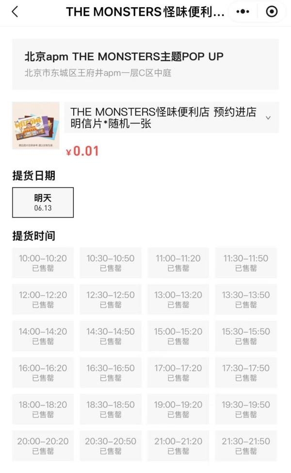 据泡泡玛特介绍,线下在快闪店购买产品,需提前预约并支付0.01元,以获得进店资格,暂不开放现场排队进店。预约时段及人数方面,每20分钟为一个时段,每个时段15人(实际可能根据场地管控进行调整,全天24个时段。进店顾客需要20分钟内完成选购并结账,每位预约成功并进店顾客仅限结账一次。6月12日起每天10:00起开放次日时段预约。