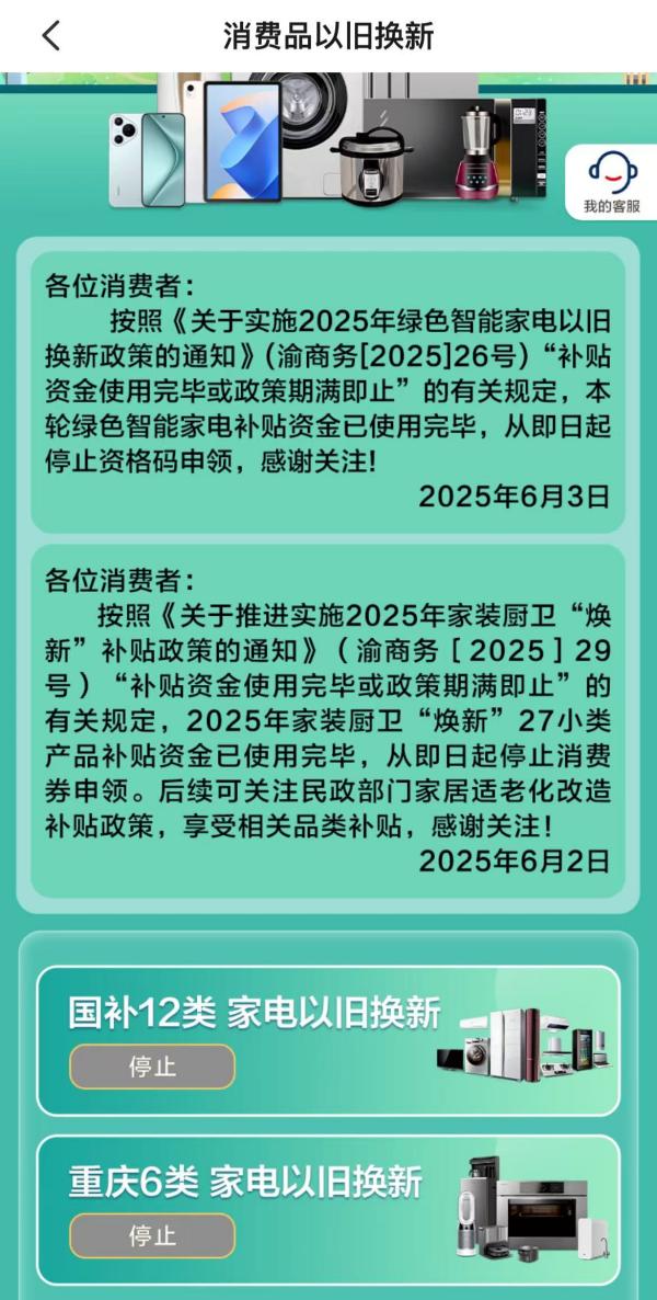 云闪付“重庆市消费品以旧换新”页面显示资格码停止申领公告。关于重庆地区2025年家电以旧换新补贴活动暂停的情况,云闪付“全国政府补贴专区”智能客服(下称“客服”给出回复:按照《关于实施2025年绿色智能家电以旧换新政策的通知》(渝商务〔2025〕26号“补贴资金使用完毕或政策期满即止”的有关规定,本轮绿色智能家电补贴资金已使用完毕,从6月3日17:15左右起停止资格码申领,下一轮活动消息,以政府通知为准。