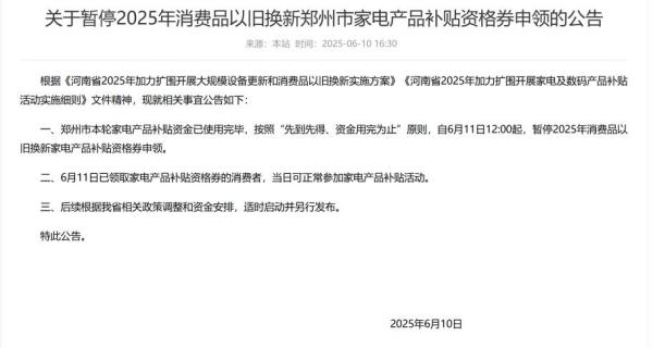 6月10日,郑州市商务局网站发布公告称,郑州市本轮家电产品补贴资金已使用完毕,按照“先到先得、资金用完为止”原则,自6月11日12:00起,暂停2025年消费品以旧换新家电产品补贴资格券申领。6月11日已领取家电产品补贴资格券的消费者,当日可正常参加家电产品补贴活动。后续根据河南省相关政策调整和资金安排,适时启动并另行发布。