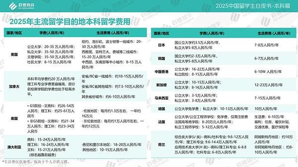 本科留学费用方面,通常而言美国、英国和澳大利亚等热门留学国家的学费较高,分别为每年约20-60万、21-61万、以及15-25万元。相比之下,加拿大与亚洲地区的学费较为亲民,例如加拿大本科年平均学费约20万元;中国香港公立大学的年学费约为16-22万元,私立大学则大约为8-15万元;日本国公立大学每年学费约3.5万元,私立大学约为5-8万元;韩国国立大学每年学费约为2-3万元,私立大学约为5-8万元。欧洲主要留学国家如法国和德国的公立学校大多免收学费,仅收取少量注册费,因此提供了较高的留学性价比。(以上费用皆已换算为人民币