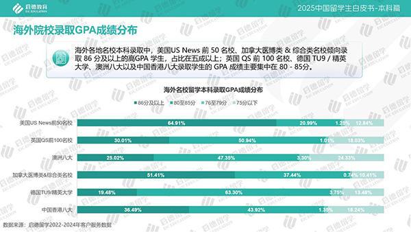 另一组海外名校本科录取数据显示,美国US News前50名校和加拿大医博类&综合类院校最看重的是高分段GPA成绩(86分及以上,尤其是美国,高分段学生的比例接近65%;英国QS前100院校、德国TU9/精英大学以及中国香港八大更集中在中高分段(80-85分,尤其是德国,中高分段学生的比例超过60%;澳洲八大以中高分段(80-85分为主(47.35%,但低分段(低于80分也占有较高的比例(27.63%,表明其录取标准较为灵活。