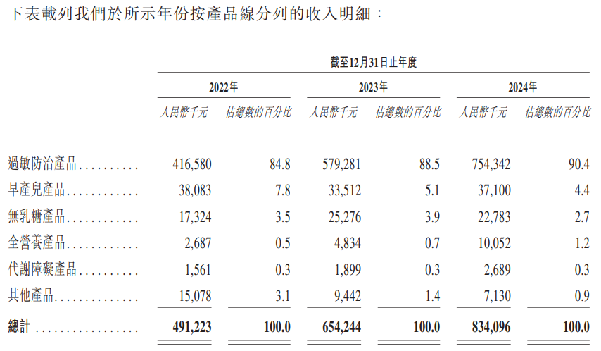 于往绩记录期间,公司很大一部分收入来源于过敏防治产品的销售,该产品于2022年、2023年及2024年分别占总收入的85.5%、88.2%及90.3%。公司来自过敏防治产品的收入由2022年的人民币419.9百万元增长37.5%至2023年的人民币577.3百万元,并进一步增长30.4%至2024年的人民币752.9百万元。