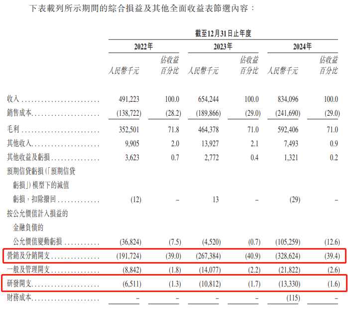 2022年、2023年及2024年,公司的营销及分销开支分别为人民币191.7百万元、人民币267.4百万元及人民币328.6百万元,分别占各期收入的39.0%、40.9%及39.4%。