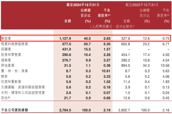 截至2023年12月31日及2024年12月31日,制造业公司贷款的不良贷款率分别为0.75%及2.83%,来自该行业借款人的不良公司贷款分别占不良公司贷款总额的12.6%及40.5%。制造业公司贷款的不良余额由截至2023年12月31日的3.28亿元上升至截至2024年12月31日的11.28亿元。