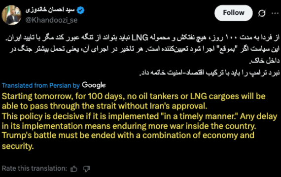“从明天开始,在100天内,未经伊朗批准,任何油轮或液化天然气(LNG)货船都不得通过该海峡,”Khandouzi说。