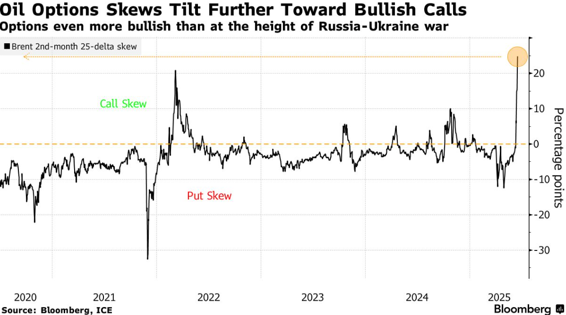与2022年俄乌冲突刚爆发之后相比,现在的原油期权更加看涨,这表明全球市场在以色列和伊朗的交锋中处于紧张状态,人们猜测美国可能会加入攻击行列。