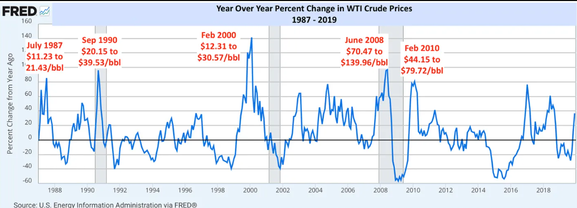 DataTrek数据显示:1987年至疫情期间,只有当油价翻倍时才会引发西方经济衰退。按WTI原油最近57.5美元的低点计算,需涨至115美元才达警戒线,目前的价格与之相距甚远。