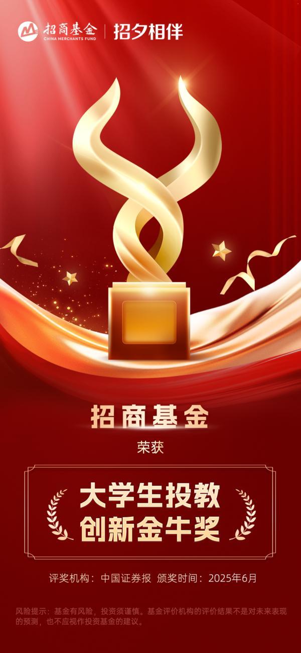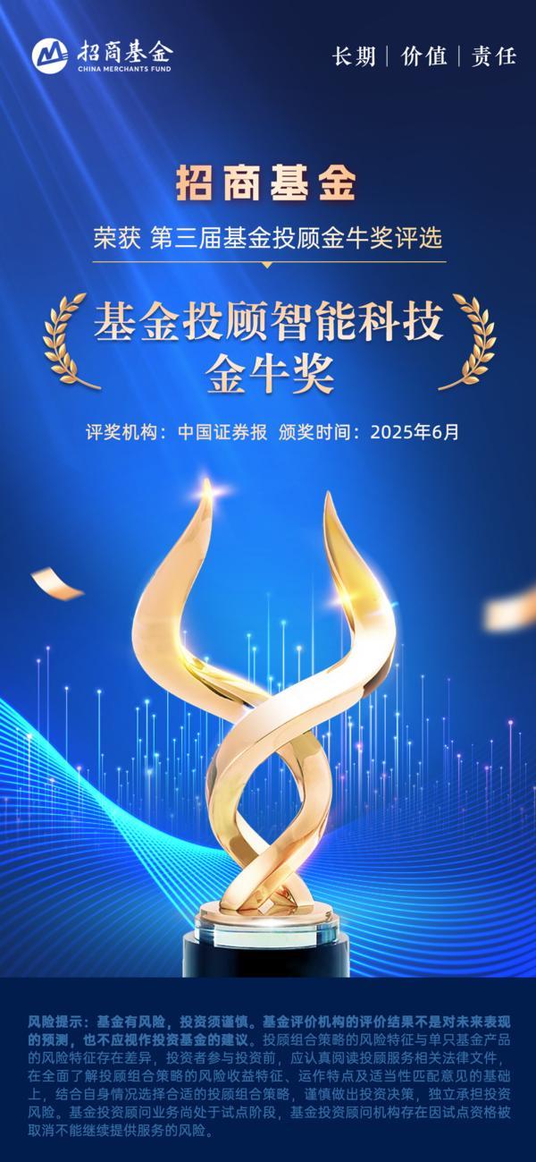 6月19日,2025金牛财富管理论坛暨第三届投顾金牛奖颁奖典礼在上海举行,招商基金荣获基金投顾智能科技金牛奖和大学生投教创新金牛奖两大奖项。
