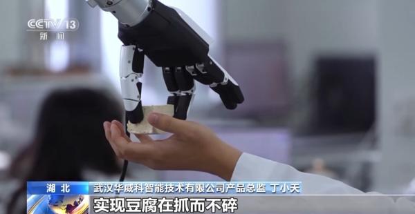 武汉华威科智能技术有限公司产品总监 丁小天:灵巧手搭载的电子皮肤,一平方厘米里面集成了近100个触觉点,通过压力的控制,使豆腐不会被抓碎。