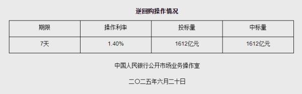 据央行网站消息,2025年6月20日中国人民银行以固定利率、数量招标方式开展了1612亿元逆回购操作。具体情况如下: